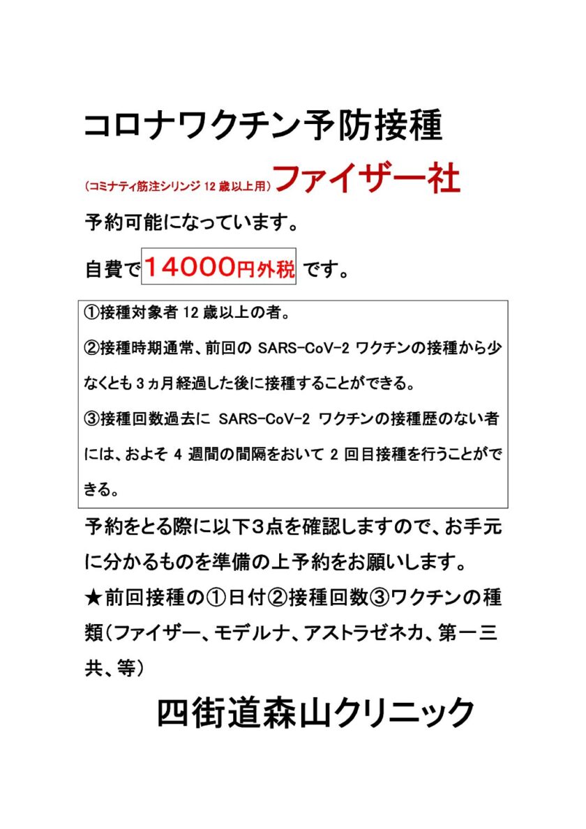 コロナワクチン(コミナティ筋注シリンジ12歳以上用)14000円外税 投稿日:2025.09.20 予約はネット https://park.paa.jp/park2/clinics/2469/businesses/09/?from_clinic_top_flg=true ライン https://lin.ee/34hk7oj で