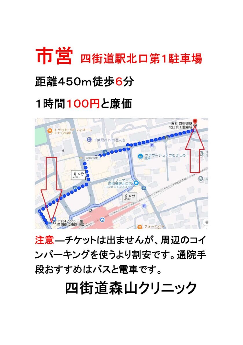 (割安)市営 四街道駅北口第1駐車場(クリニックより徒歩450m) 投稿日:2025.10.18 提携駐車場ではないのでコインは出ませんが割安です。1時間100円です。 市営 四街道駅北口第1駐車場 〒284-0003 千葉県四街道市鹿渡934−24